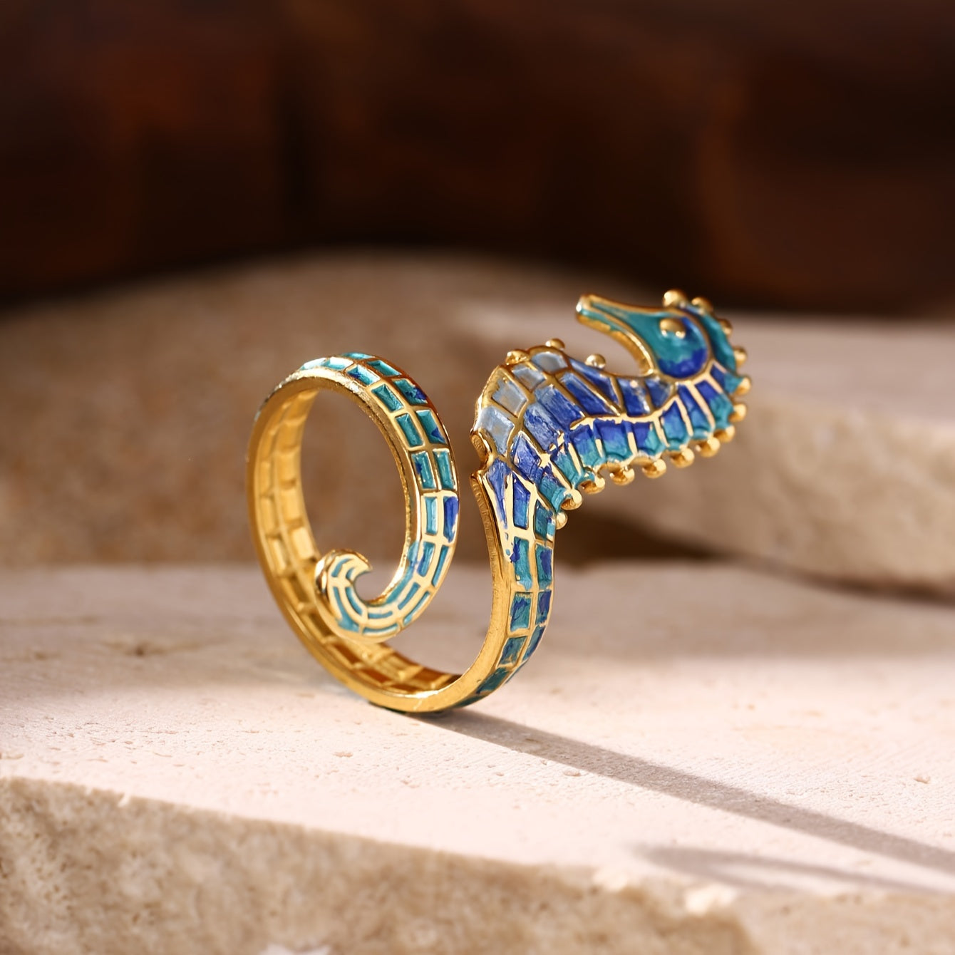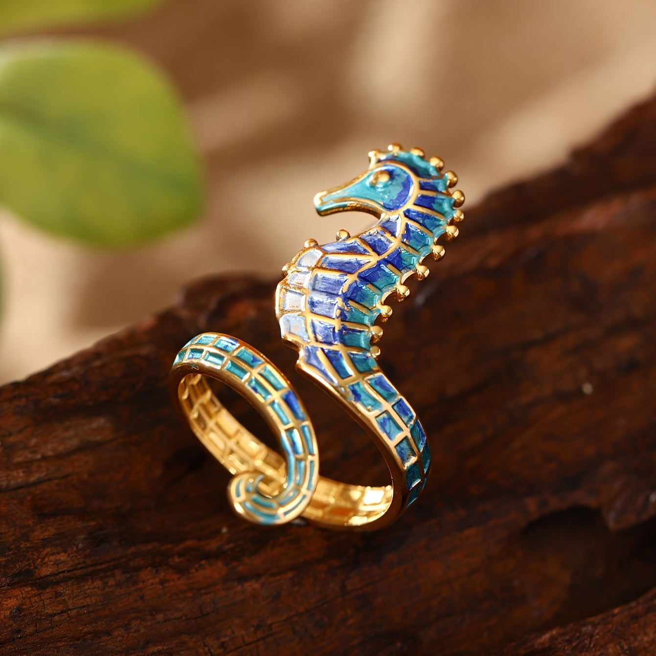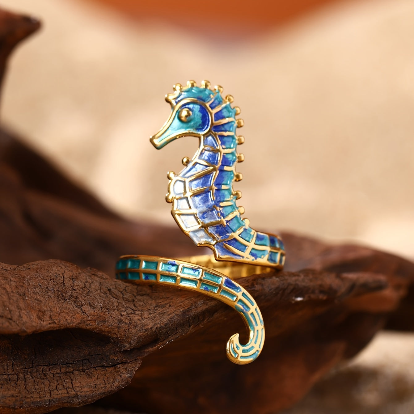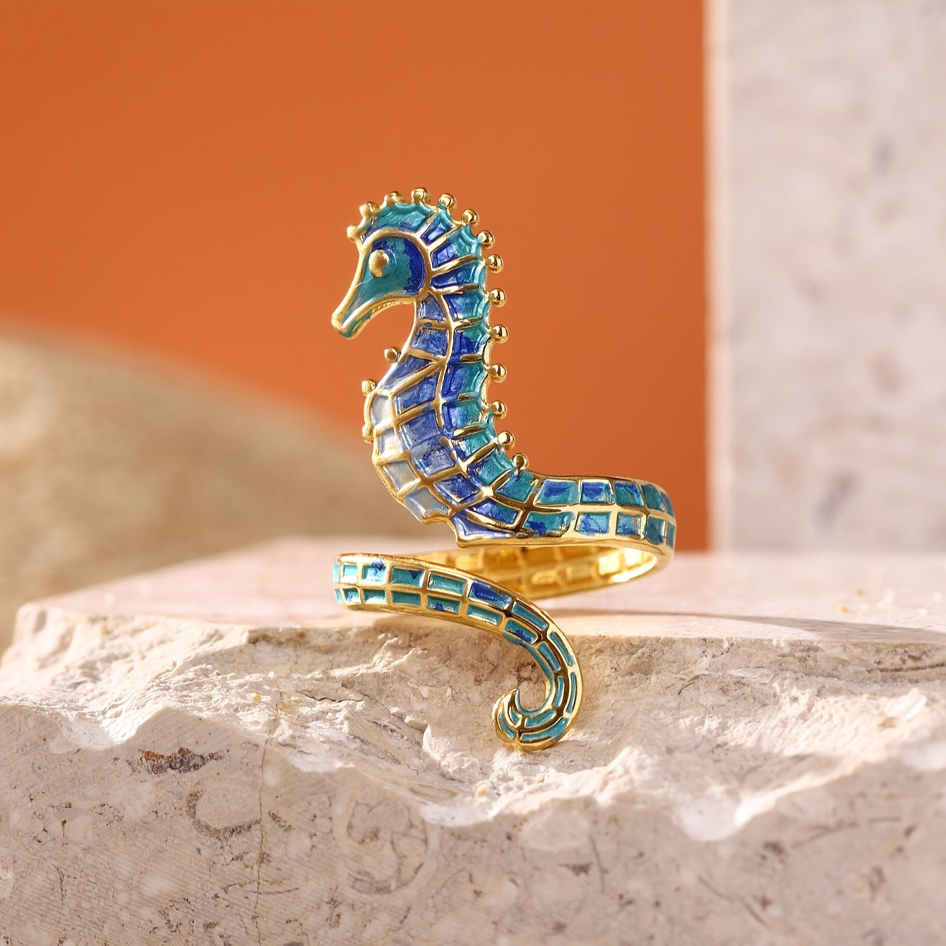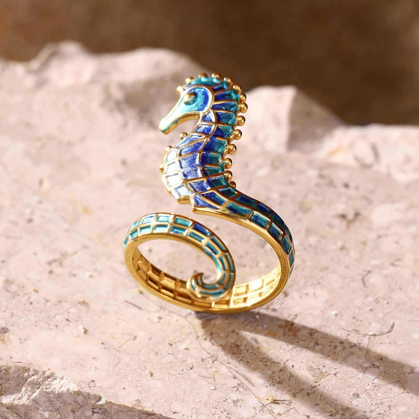 海の深さとヴィンテージの優雅さにインスパイアされたこのステンレススチールのタツノオトシゴリングは、自由、旅行、そして静かな自信の精神を呼び起こします。繊細なエナメル仕上げと独自のデザインを持つこの作品は、個性をささやくようなもので、海を心に抱く人々にぴったりです。