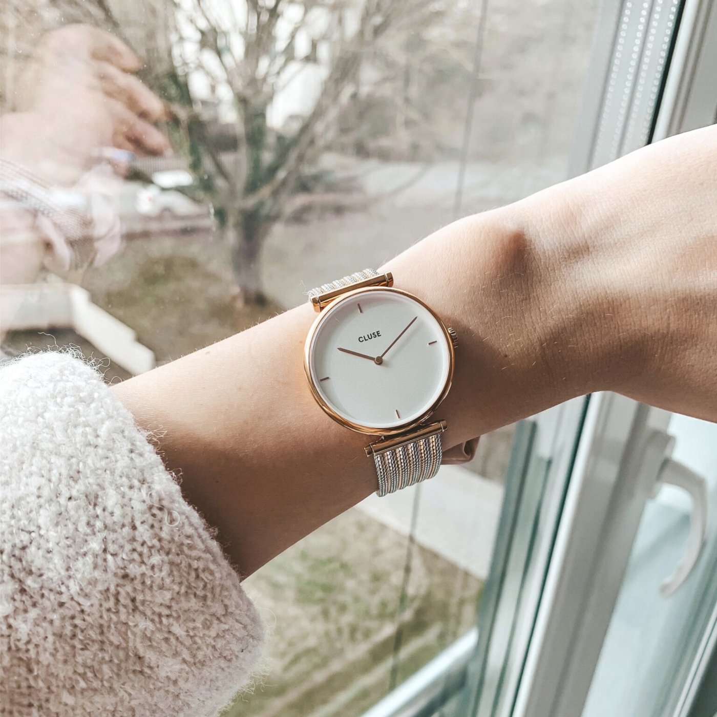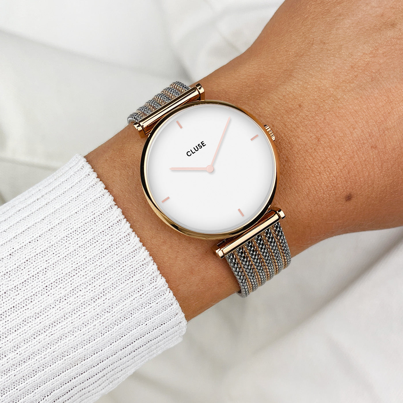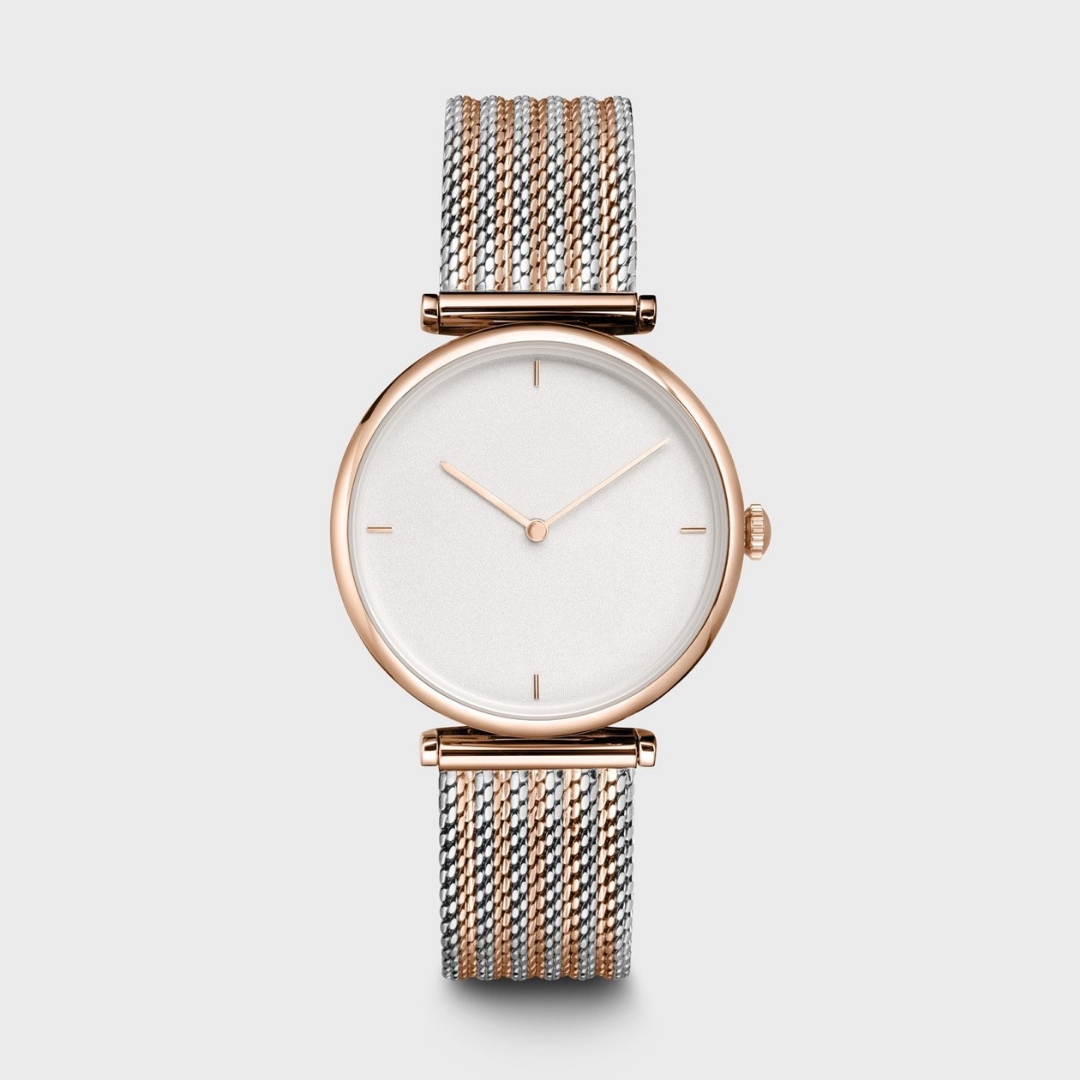 この洗練されたバイカラーの時計で控えめなエレガンスを楽しんでください。変色しない耐水性のステンレススチールで作られており、自然に多用途ナルックを実現しています。