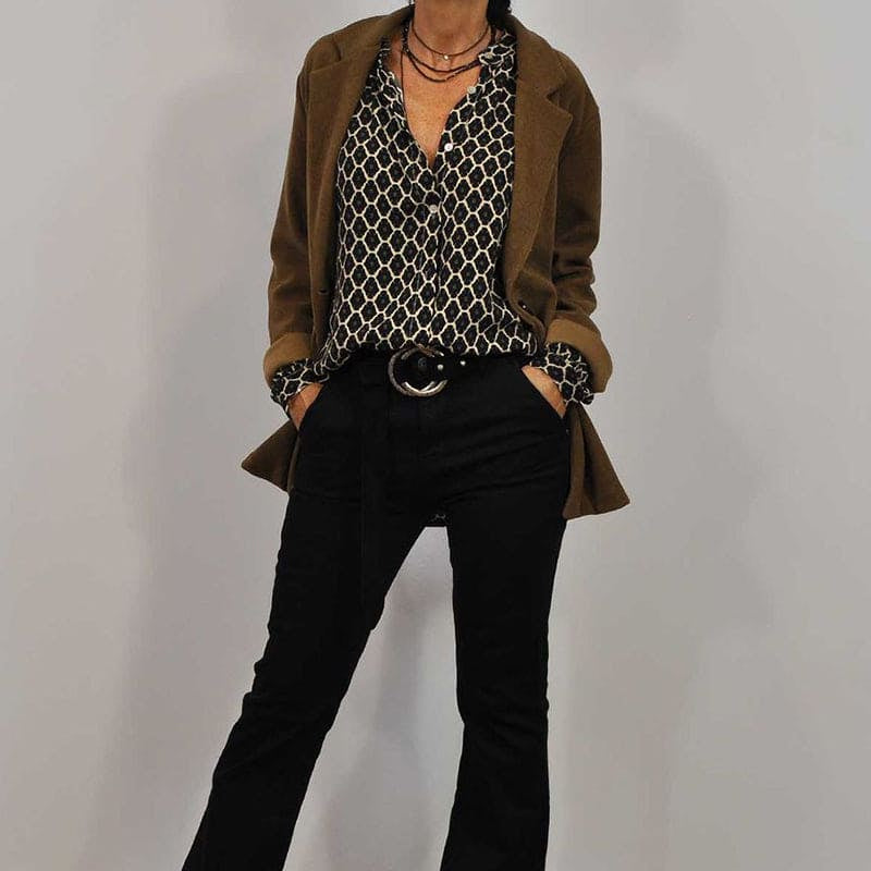 楽なスタイル: GeertjeリラックスVネックミディシャツは、クラシックなVネックデザインと大胆な幾何学プリントを組み合わせ、カジュアルな外出やドレスアップした機会に最適です。時代を超えたガンエレスが、楽しさに注目することを保証します。ジーンズやテーラードパンツと合わせると、多用途なスタイルになります。