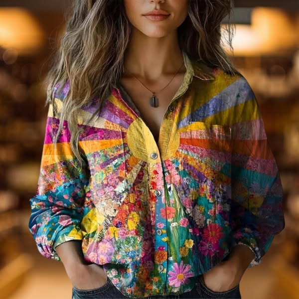 パープルでユニークなデザイン: Tinekeの明るいひまわりブラウスは、美しい花柄とサンバースト柄が特徴です。どんな服装も生き生きとした個性溢れるものにしてくれます。芸術的なプリントは、ローブワードにカラフルな彩りを加え、どんなシーンでも明るくしてくれる完璧なアイテムです。